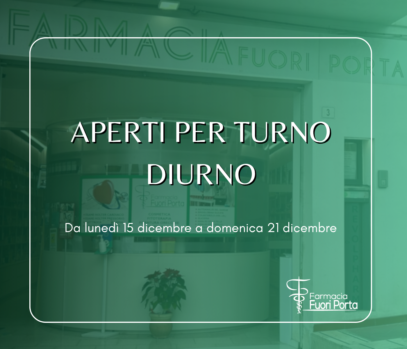 La farmacia è aperta per turno diurno da lunedì 15 dicembre a domenica 21 dicembre